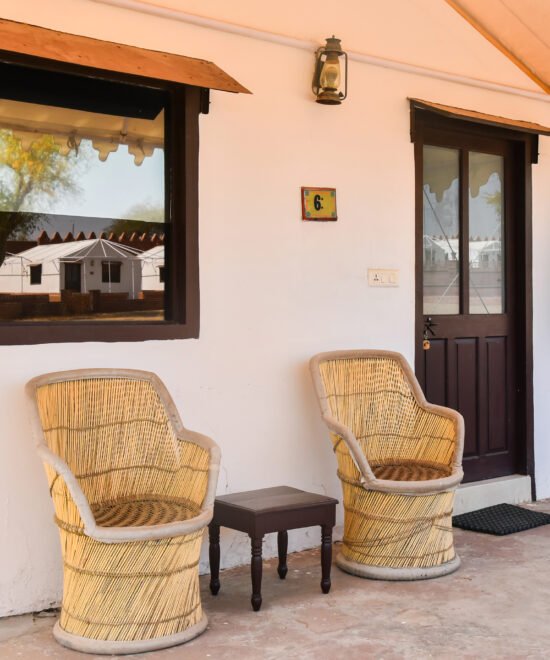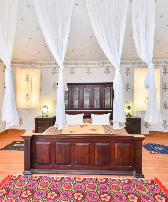 Desert Royal Luxury Room is a harmonious blend of heritage elegance and modern sophistication. Surrounded by the timeless charm of the desert, the room features finely crafted wooden furniture, soft earthy tones, and hand-printed motifs that reflect Rajasthan’s regal artistry